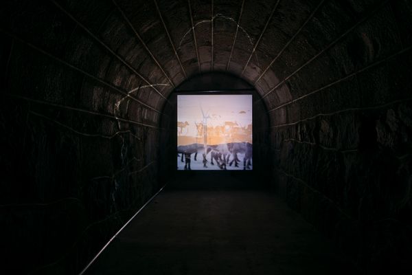 Aikio’s new work for Helsinki Biennial 2023 was a video and sound installation located inside one of the old gunpowder magazines on Vallisaari Island. The work is informed by his cultural background and lived experience, and it addresses conflicts around the use of natural resources, nature conservation, fossil-free energy production and more broadly human relations with other living beings. Understanding nature as something outside or external to the human realm, as an object of extraction or conservation, is revealed as a blind spot that inevitably affects the way nature is understood and treated.