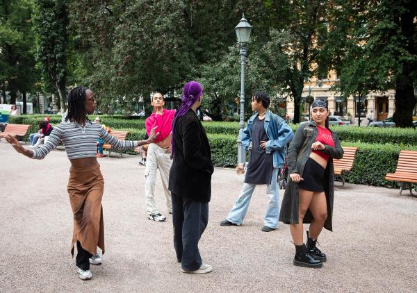 The work was realized in collaboration with BIPOC artists in Helsinki and is thus rooted in local conversations and urgencies. common moves was experienced in Helsinki between 29 July and 13 August 2023 in several public spaces: Helsinki Central Library Oodi, Esplanadi park and Tallinnanaukio in Itäkeskus. Some of the dates, times and locations of the practices were published before hand and some were encountered without notice.