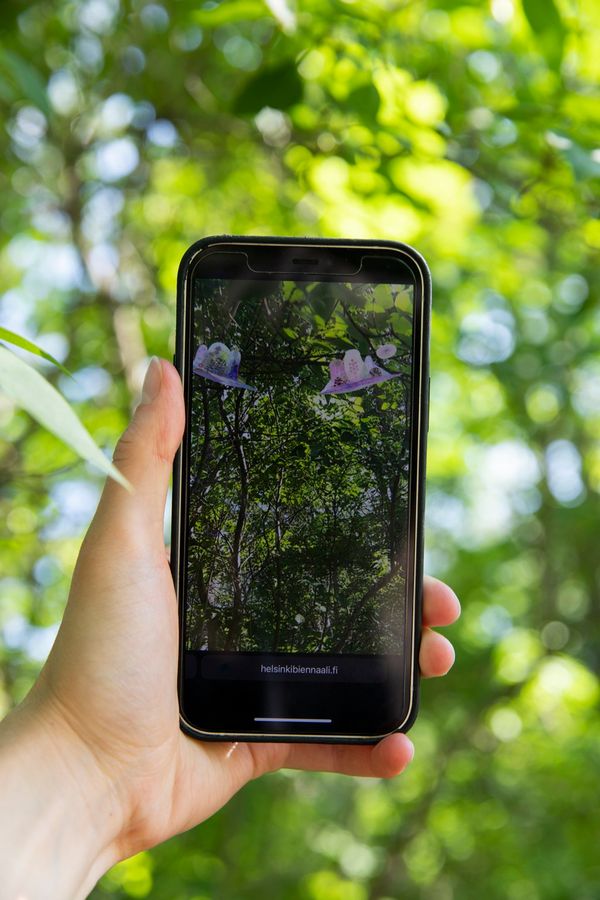 Treister’s watercolour paintings were accompanied by a new AR component in which the Interplanetary Meditation and Biospheres Islands appear to float high up in the sky.