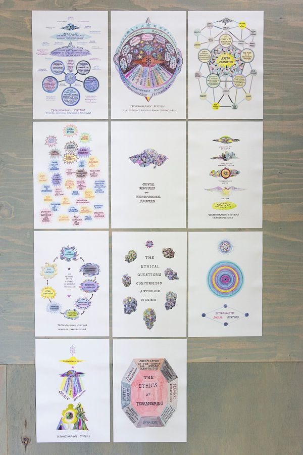 The project comprises Project Diagrams, Earth Eco Systems and Architectures, Reinvented Technologies, Interplanetary Social Structures, Designs for Spacecraft, Apparel, Interplanetary Space Habitations, Interplanetary Meditation and Biospheres Islands, Crystal Architectures, Vultures, Rituals, Stars and Visions.